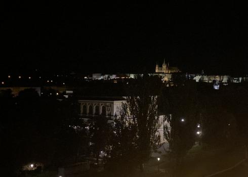 Wenn die Moldau „in Prag angekommen“ ist, verstummt die Musik – und ich bin voller Energie. Am Morgen ist das ideal: der Tag darf beginnen, das Buchprojekt ruft, hier oder im Café um die Ecke. Am Abend aber ist es anders. Dann muss ich diese Energie in Ruhe verwandeln, in die Gelassenheit, die zum Schlaf führt. Und da gibt es ein Schauspiel, das mich sanft beruhigt, wenn ich rechtzeitig ans Fenster trete. Schon am zweiten oder dritten Abend bemerkte ich es: Punkt Mitternacht erlöschen die Lichter der Burg. Dann lehne ich mich ein wenig hinaus – nicht zu weit, gut festgehalten – und starre die Burg an. Auf keinen Fall den Blick abwenden, um den Moment nicht zu verpassen. Ich warte, und dennoch überrascht es mich immer wieder: das Licht erlischt, die Burg verschwindet. Gute Nacht, Prag.
