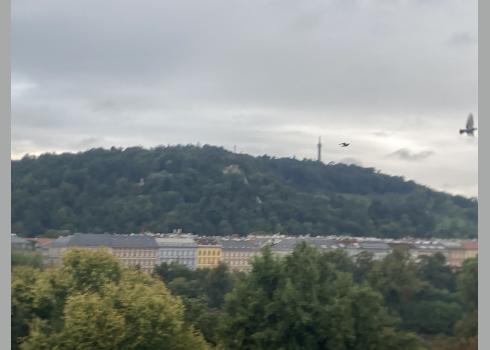 Also halte ich mich fest am Fensterrahmen, damit ich nicht falle, und beginne mein Ritual. War es schon am ersten Abend? Vielleicht am zweiten. Da diese Melodie ohnehin in meinem Kopf kreiste, folgte ich einer spontanen Eingebung: Smetanas „Vltava“ hören, mit Kopfhörern auf den Ohren, während ich die „wirkliche“ Moldau betrachte – mit ihren Wellen, mit ihren Vögeln. Diese Vögel! … die allein oder in Schwärmen den Himmel zerschneiden, das Horizontband herausfordern oder sich leise aufs Wasser setzen. Wenn ich wiederkehre, will ich über diese Vögel schreiben!