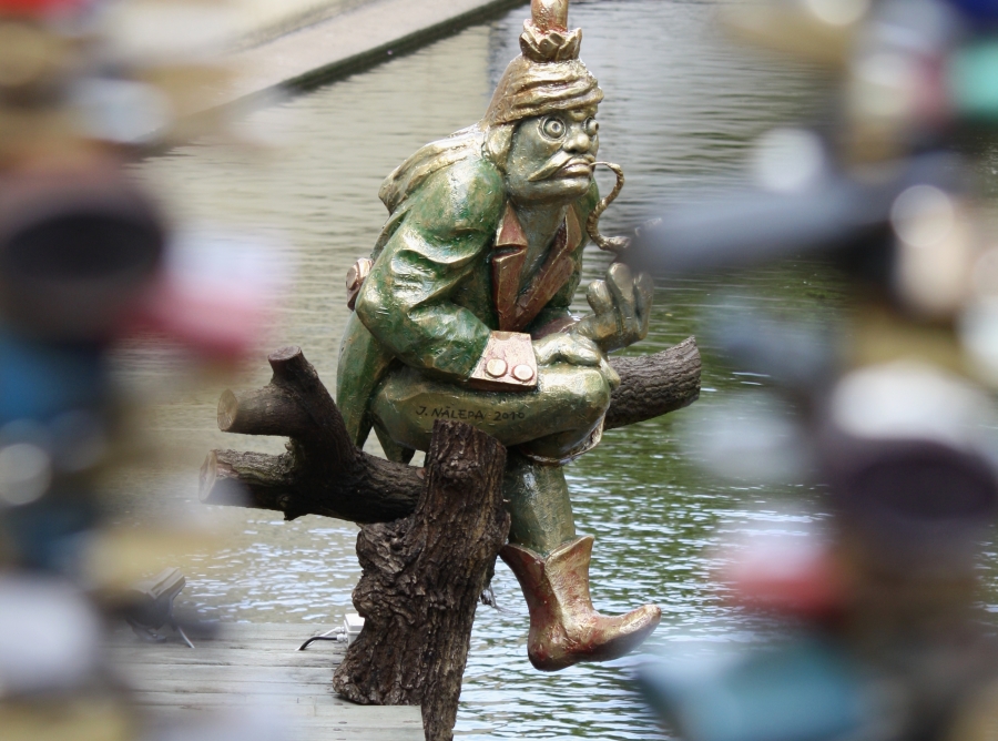 An einem Mühlrad über dem Teufelsbach thront seit 2010 eine Wassermannstatue, komplett mit Zipfelmütze, Froschaugen und Tabakspfeife, das Werk des Bildhauers Josef Nálepa. Kunst oder Kitsch? Ich bin mir nicht sicher.